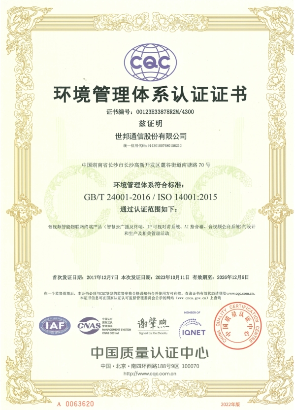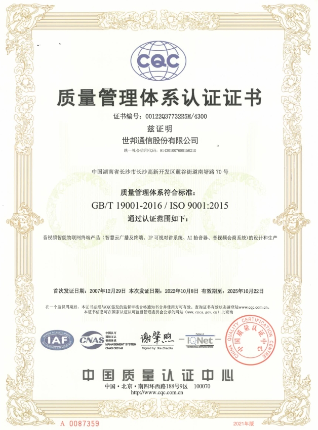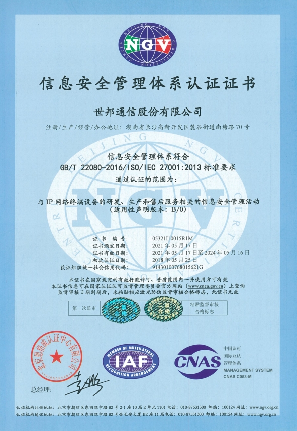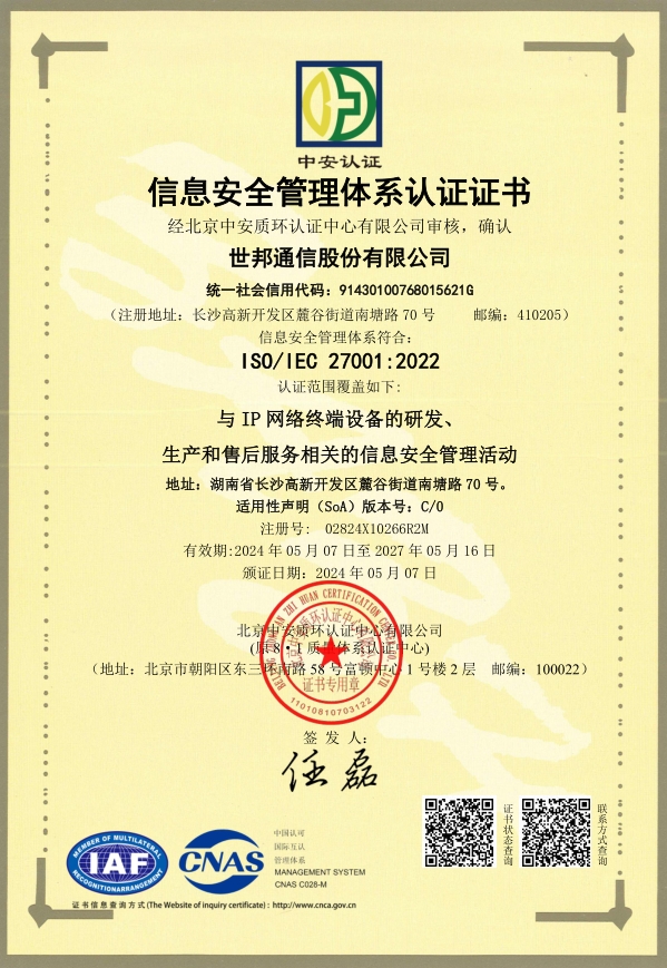 世邦通信27000认证证书