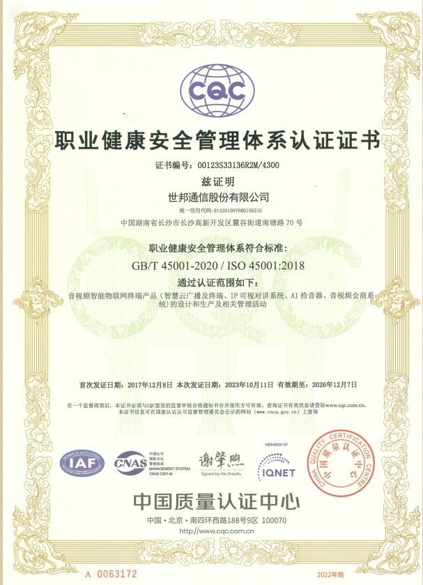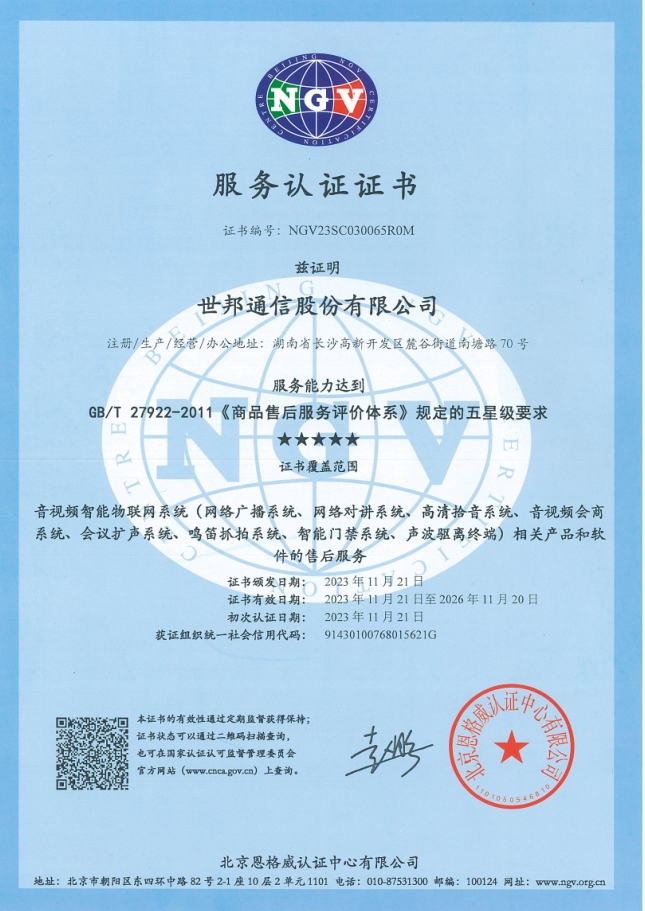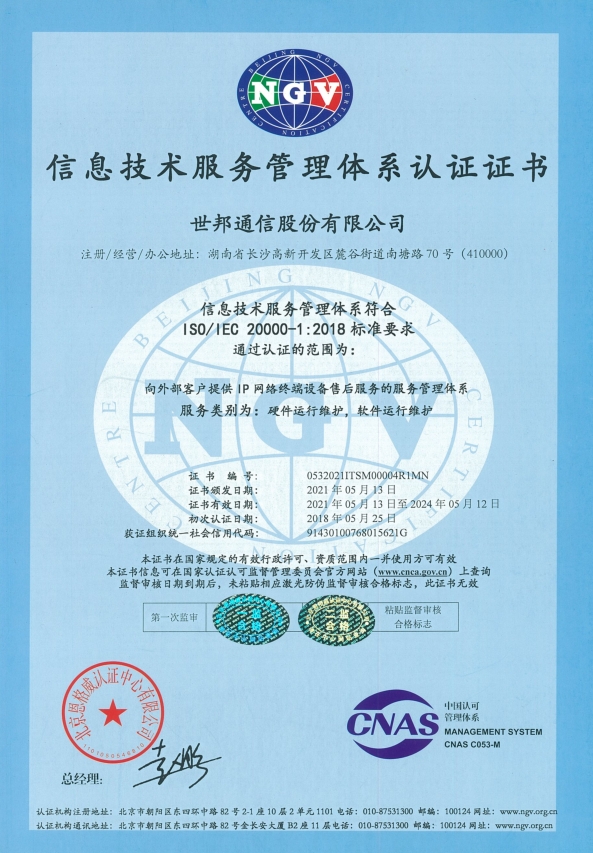 世邦通信20000认证证书